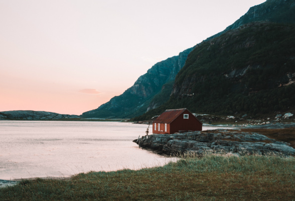 Hytte i norsk landskap. Foto.
